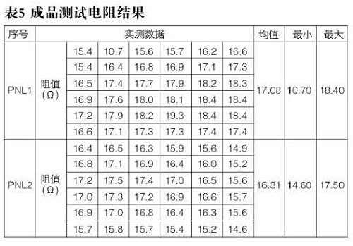 成品測試電阻如表5所示,2PNL板電阻全部合格,但是相對于蝕刻的半成品,成品電阻降低了1.5歐姆。
