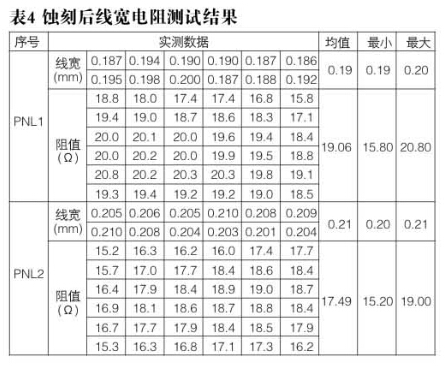 測試板2PNL,蝕刻得到PNL1線寬均值0.19mm,實測相應阻值在15.8到19Ω;PNL2線寬均值0.21mm,實測相應阻值在15.2Ω到17.5Ω。首次作并不確定后流程會對電阻造成多大影響,故繼續(xù)跟進測試板到成品后的電阻測試結(jié)果。