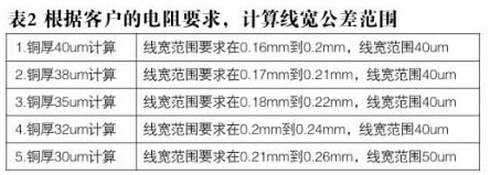 面銅控制中值在35um,則實際完成銅厚在30到40um之間,根據(jù)客戶的電阻要求,計算線寬公差范圍如下表2,根據(jù)下表計算結(jié)果,控制銅厚理論優(yōu)區(qū)間32到40um之間。