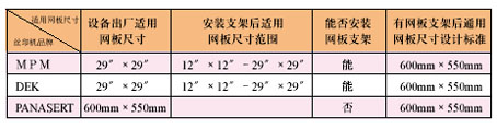全球范圍內(nèi),絲網(wǎng)印刷機(jī)品牌和型號(hào)較多,其中主流品牌主要有“MPM”、“DEK”、“PANASERT”等,所有這些品牌的印刷機(jī)都需使用到絲網(wǎng)板(鋼模板)Stencil,以上三種主流品牌印刷機(jī)對(duì)Stencil尺寸要求如下表: