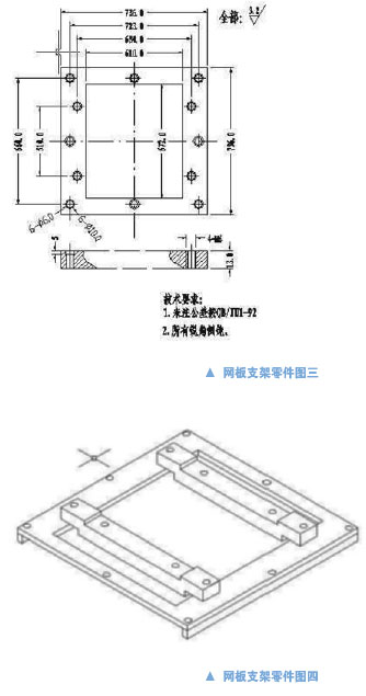 為保證網(wǎng)板支架和鋼模板安裝定位,使用連接固定螺釘(Screw),保證其安裝連接的穩(wěn)定和通用性,對(duì)安裝連接螺釘、網(wǎng)板支架連接孔、網(wǎng)板連接孔的尺寸要求比較特殊。經(jīng)過分析和實(shí)際使用,可以采用M4的公制螺釘和螺紋孔;或者采用5/32的美制螺釘和螺紋孔,以上兩種尺寸和公英制基本上可以通用。