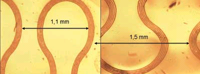 將感光耐蝕膜通過旋轉(zhuǎn)噴涂的方式涂在銅箔上,再通過馬蹄形光掩模板刻蝕出圖案,這種形狀相比其他形狀(例如橢圓形)能夠減少46%的拉力。另外,將每條導(dǎo)線分成四條并行導(dǎo)線的方式也增大了電路的彈性,不影響性能。