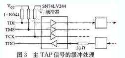 為保證信號(hào)的完整性,本文對(duì)來(lái)自測(cè)試裝置的主TAP控制信號(hào)進(jìn)行了緩沖處理,同時(shí)用上拉電阻將TDI、TMS信號(hào)拉至邏輯1狀態(tài),將TCK下拉接地。另外,在后一個(gè)器件的TDO和被測(cè)板的TDO端口之間放置一個(gè)20 Ω的電阻以衰減反射。緩沖器類(lèi)型的選用要參考電路板上器件的電平類(lèi)型。如圖3所示,被測(cè)板上邊界掃描器件工作電壓為3.3 V,本文選用的緩沖器SN74LV244的工作電壓為2.7 V~5.5 V,可以滿(mǎn)足需要。