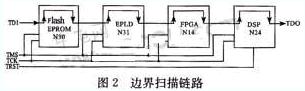 在此目標(biāo)板上,我們將Flash EPROM(N30)、DSP(N31)、EPLD(N14)和FPGA(N24)依次連接起來(lái),成為一個(gè)完整的掃描鏈路。TAP控制信號(hào)(TCK、TMS、TRST*)并聯(lián),前一器件的TDO和后一器件的TDI依次連接成鏈。其中只有DSP有TRST*信號(hào)。對(duì)于TRST*信號(hào),因?yàn)樗堑碗娖接行?,若在器件?nèi)部或者電路板上已經(jīng)上拉,則在測(cè)試時(shí)可以不加以控制。而在該目標(biāo)板的DSP內(nèi)部此引腳處于下拉狀態(tài),為使其進(jìn)人邊界掃描狀態(tài),必須外加激勵(lì)信號(hào),因此本文把它單獨(dú)引出來(lái)。如圖2所示。