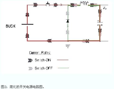 圖2所示的簡化電路圖對(duì)了解基本情況幫助甚大??匆豢措娏魍罚喊袴ET在導(dǎo)通狀態(tài)下的回路標(biāo)記為紅色;把FET在截至狀態(tài)下的回路標(biāo)記為綠色。我們可以觀察到兩種不同情況:有兩種顏色的區(qū)域和僅一種顏色的區(qū)域。我們必須特別關(guān)注后一種情況,因此時(shí)電流在零和滿量程之間交替變化。這些是具有高di/dt的區(qū)域。
